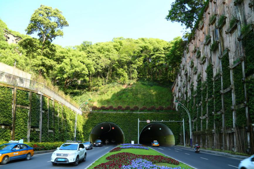 忠山隧道是我市主城區(qū)建設(shè)的首條隧道工程,針對(duì)不同坡度邊坡,采用了布袋法、生態(tài)袋法、掛網(wǎng)噴播等方式,讓垂直墻面邊坡迅速覆綠,為瀘州市打造了一條優(yōu)質(zhì)的綠色景觀隧道。