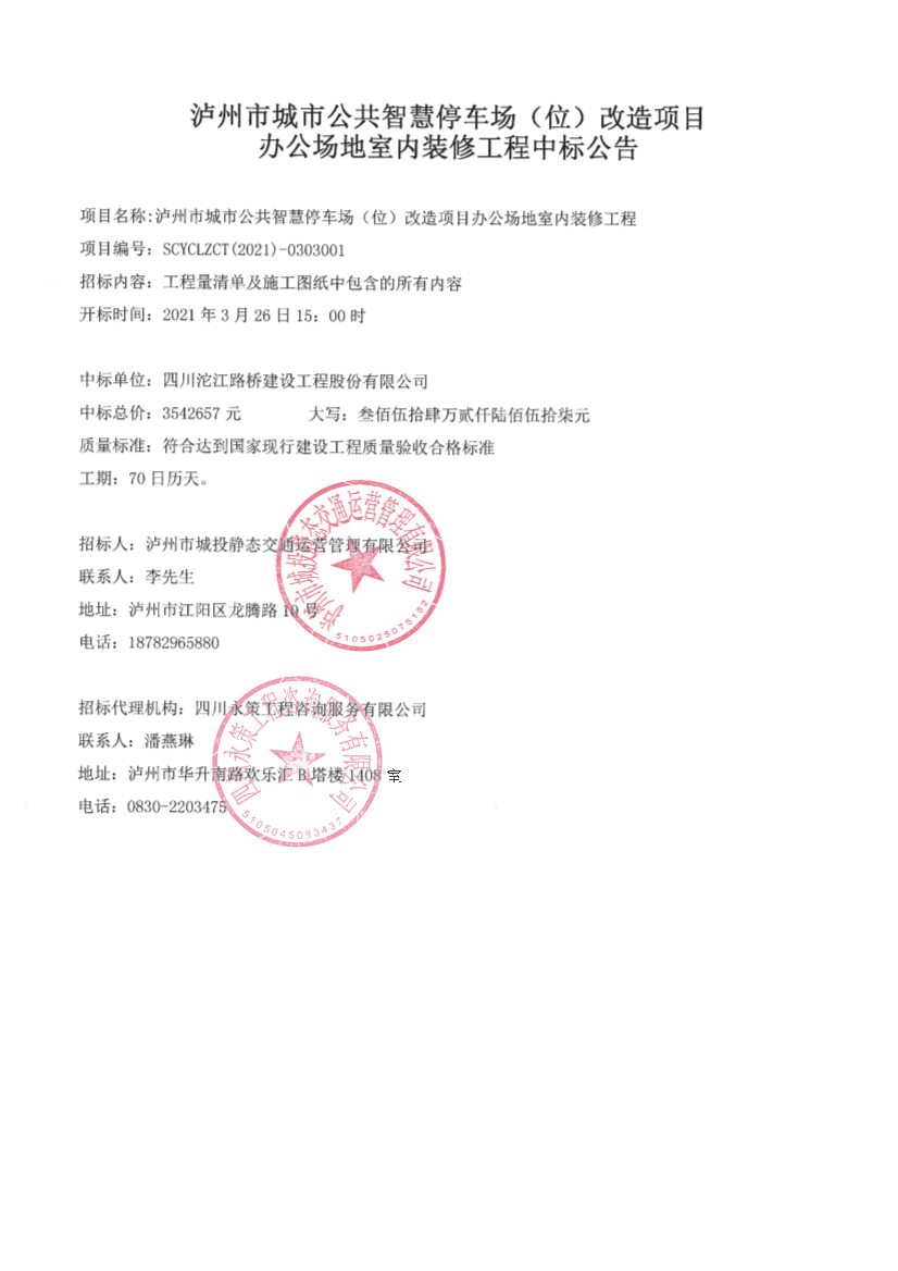 瀘州市城市公共智慧停車(chē)場(chǎng)(位)改造項(xiàng)目辦公場(chǎng)地室內(nèi)裝修工程中標(biāo)公告